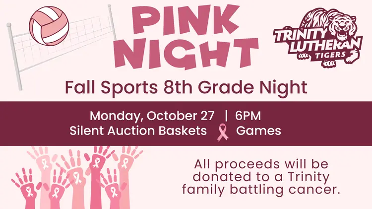 Join the volleyball teams on Oct. 27 for our 8th Grade and Pink Night! All proceeds for the evening will benefit a Trinity family in need.There will be a silent auction, games, food, and other items to purchase. We will also be celebrating our 8th graders in between games. Games start at 6 and 7pm.