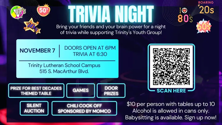 Trinity’s Youth Group will host a trivia night Friday, November 7. Doors open at 6pm and trivia starts at 6:30pm. Tickets are $10 per person with tables up to 10. Babysitting is available. There will be prizes for the best dressed/decorated table with the theme decades! The Youth will be holding