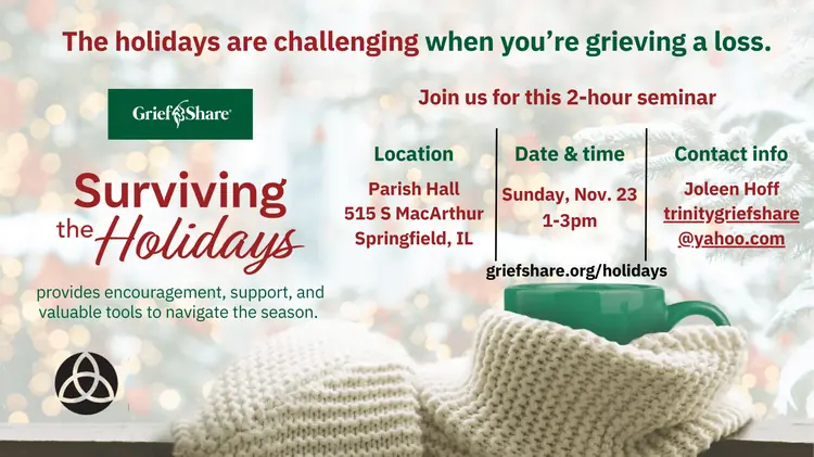 GriefShare: Surviving the Holidays is a helpful, encouraging seminar for people facing the holidays after a loved one’s death. Please join us on Sunday, Nov. 23, 2025 at Trinity’s School Campus Parish Hall from 1-3pm. The seminar features video interviews with counselors, grief experts, and other pe