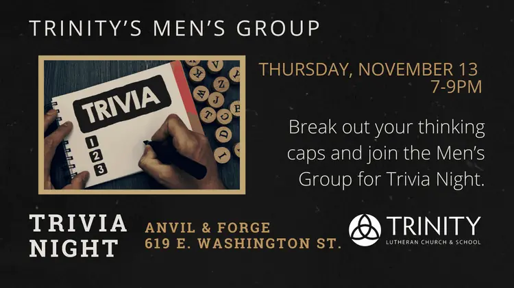 Join us for fellowship and trivia at Anvil and Forge Brewery downtown from 7-9pm on Thursday, November 13th.